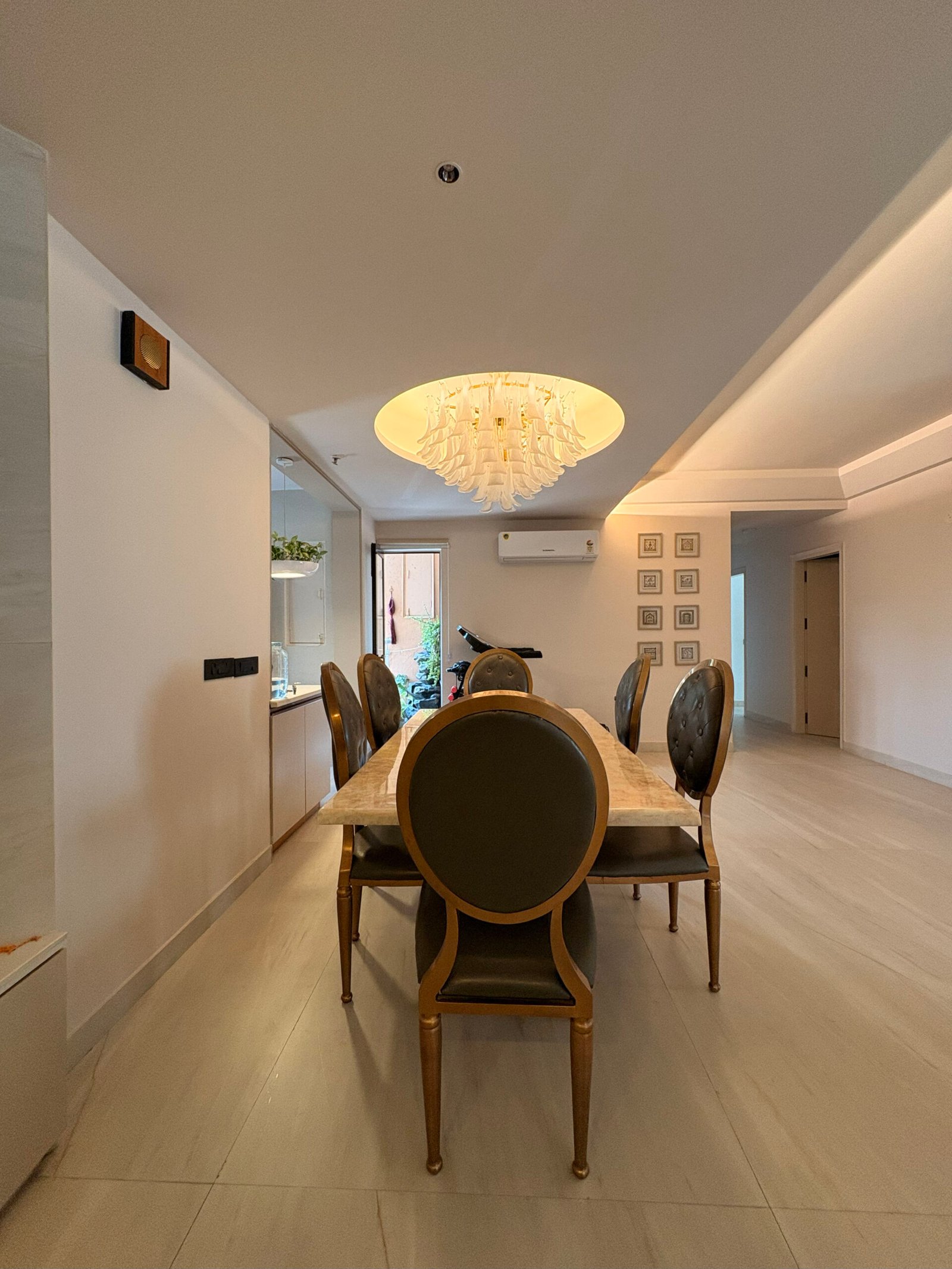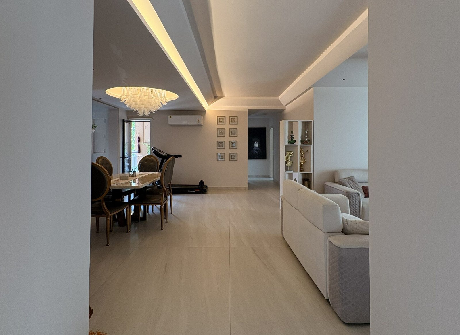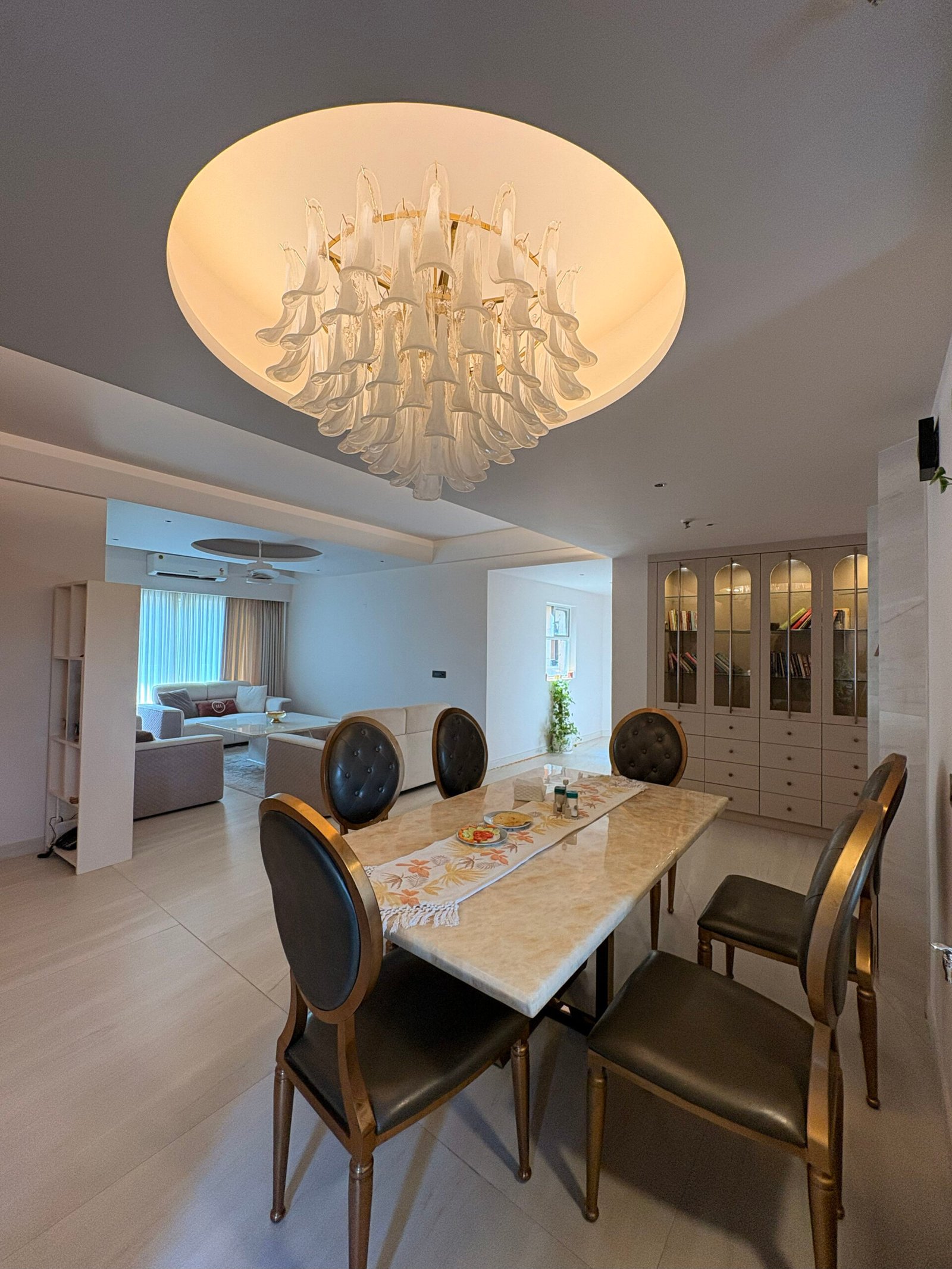 The entryway is designed as a bright passage filled with natural light, leading to an L-shaped living and dining area. To maintain a sense of openness, we minimized the use of false ceilings, incorporating them only where necessary to conceal services. The central space is left open to enhance volume, while the dining and living clusters feature a circular recessed ceiling to host a chandelier and fan, complemented by strategically placed indirect mood lighting.