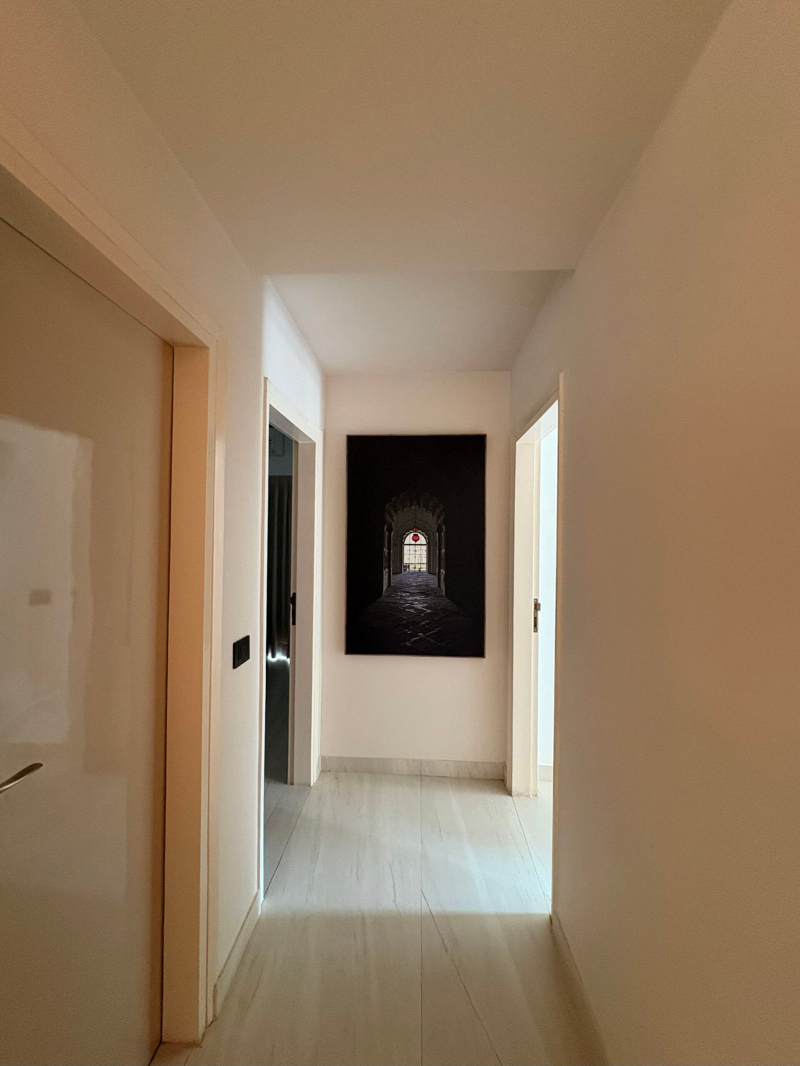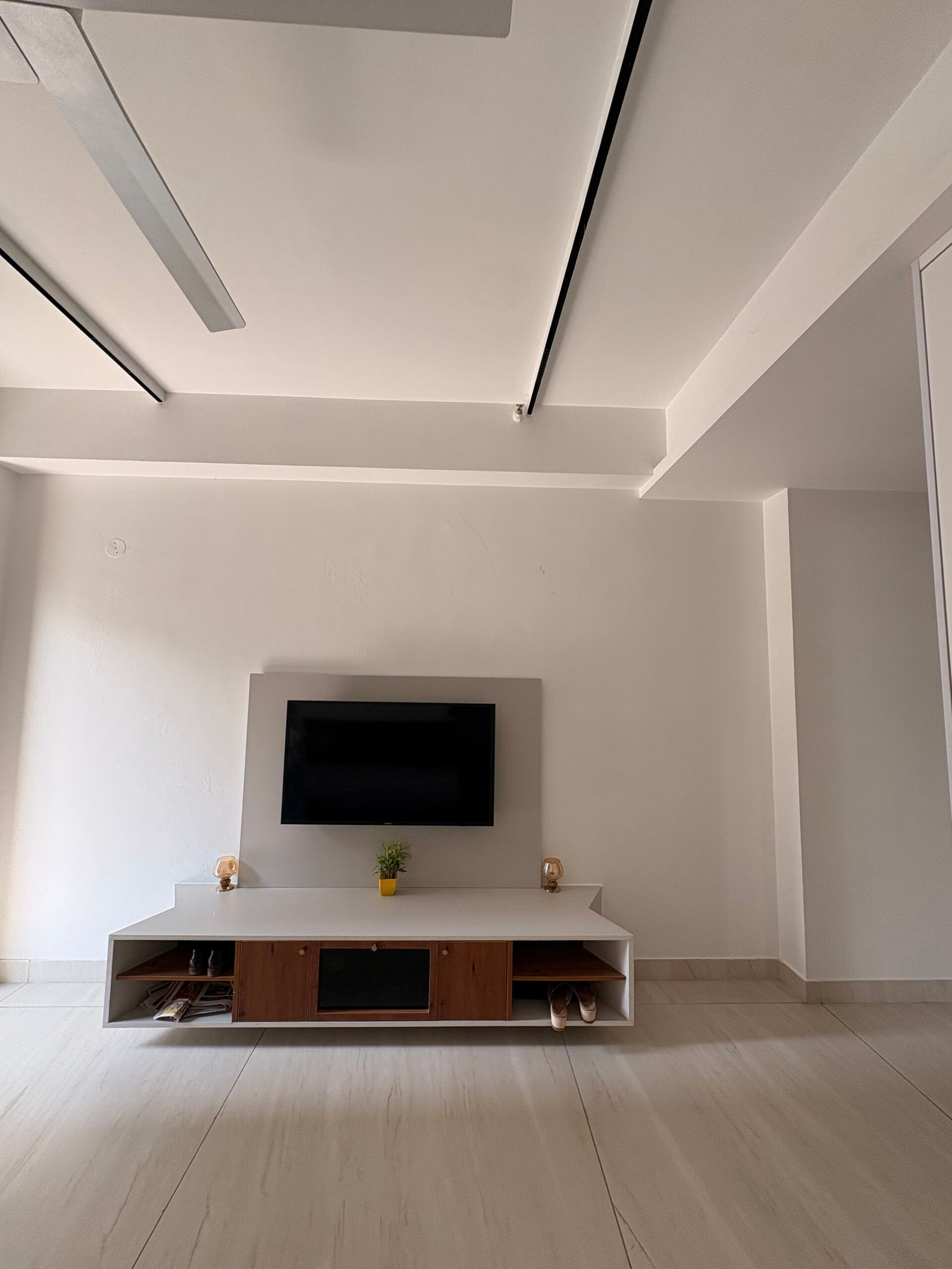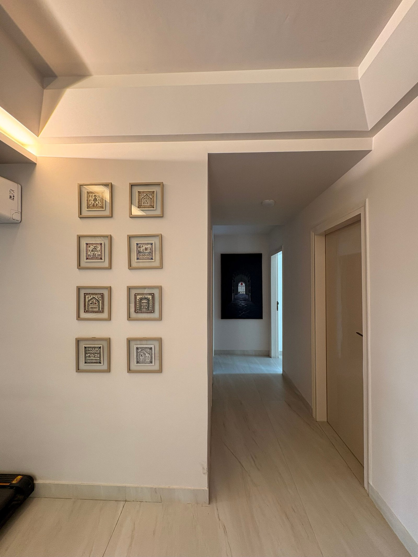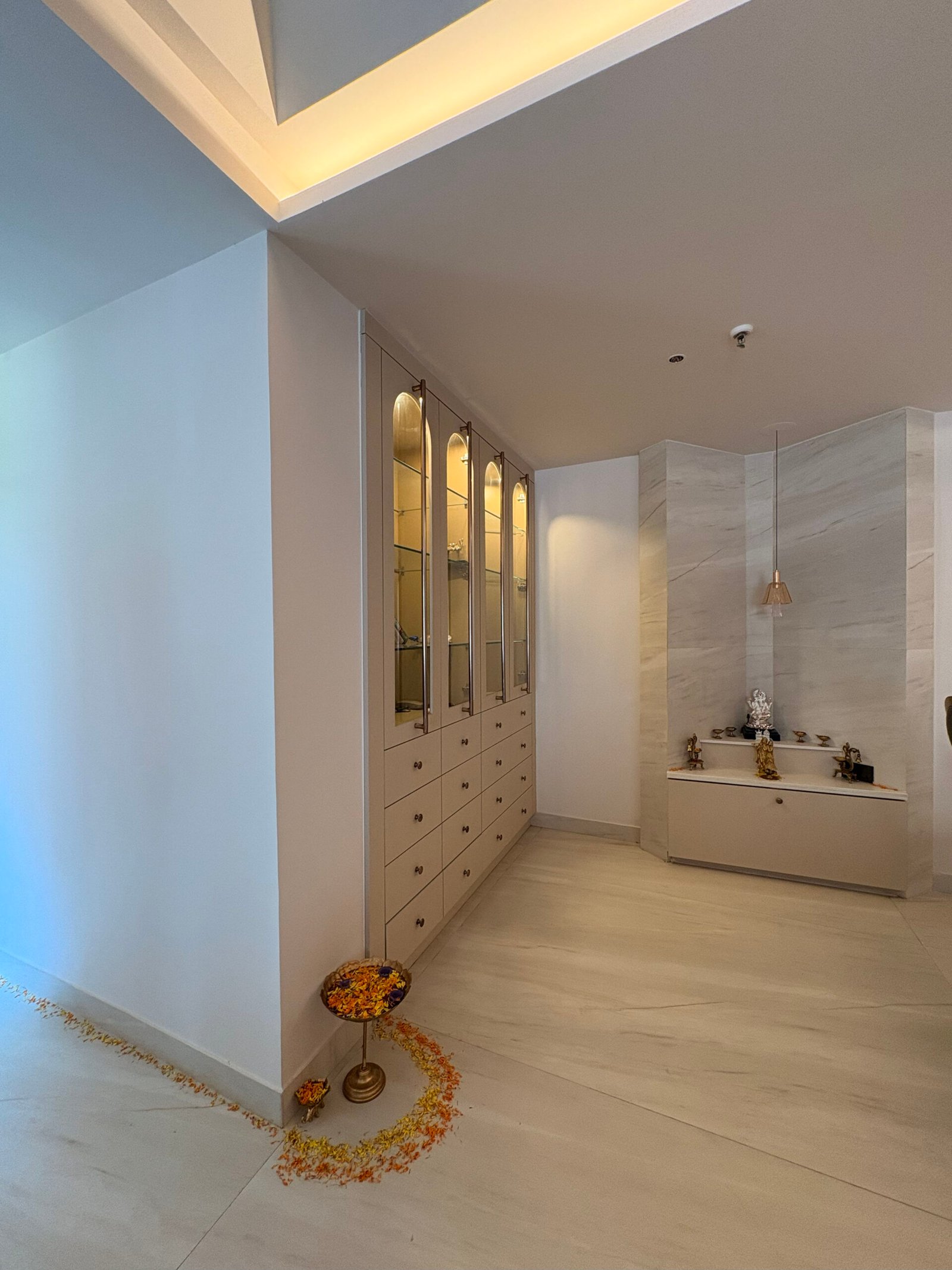 The entryway is designed as a bright passage filled with natural light, leading to an L-shaped living and dining area. To maintain a sense of openness, we minimized the use of false ceilings, incorporating them only where necessary to conceal services. The central space is left open to enhance volume, while the dining and living clusters feature a circular recessed ceiling to host a chandelier and fan, complemented by strategically placed indirect mood lighting.