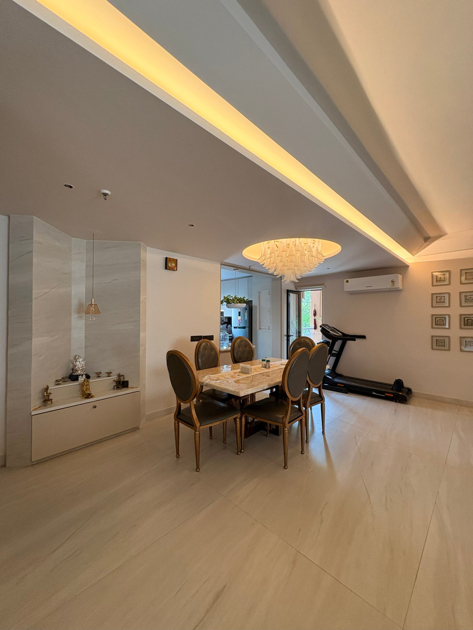 The dining space is anchored by a luxurious dining table, paired with a crockery cabinet and a dedicated niche for a Mandir (prayer space). The Mandir is positioned to allow ample space for seating, creating a peaceful corner for spiritual moments. Opposite the Mandir wall, a series of handmade silk paintings by Orissa artisans adds an artistic touch.
