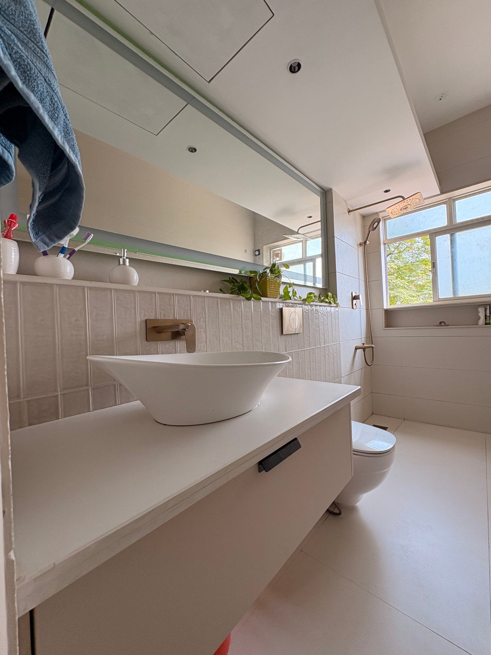 The bedrooms are designed with a focus on volume and simplicity, avoiding heavy false ceilings and using track lighting for functional illumination. Bathrooms feature light tones like white and cream, combined with varied textures and a mix of reflective and matte surfaces, creating dynamic lighting effects throughout the day.