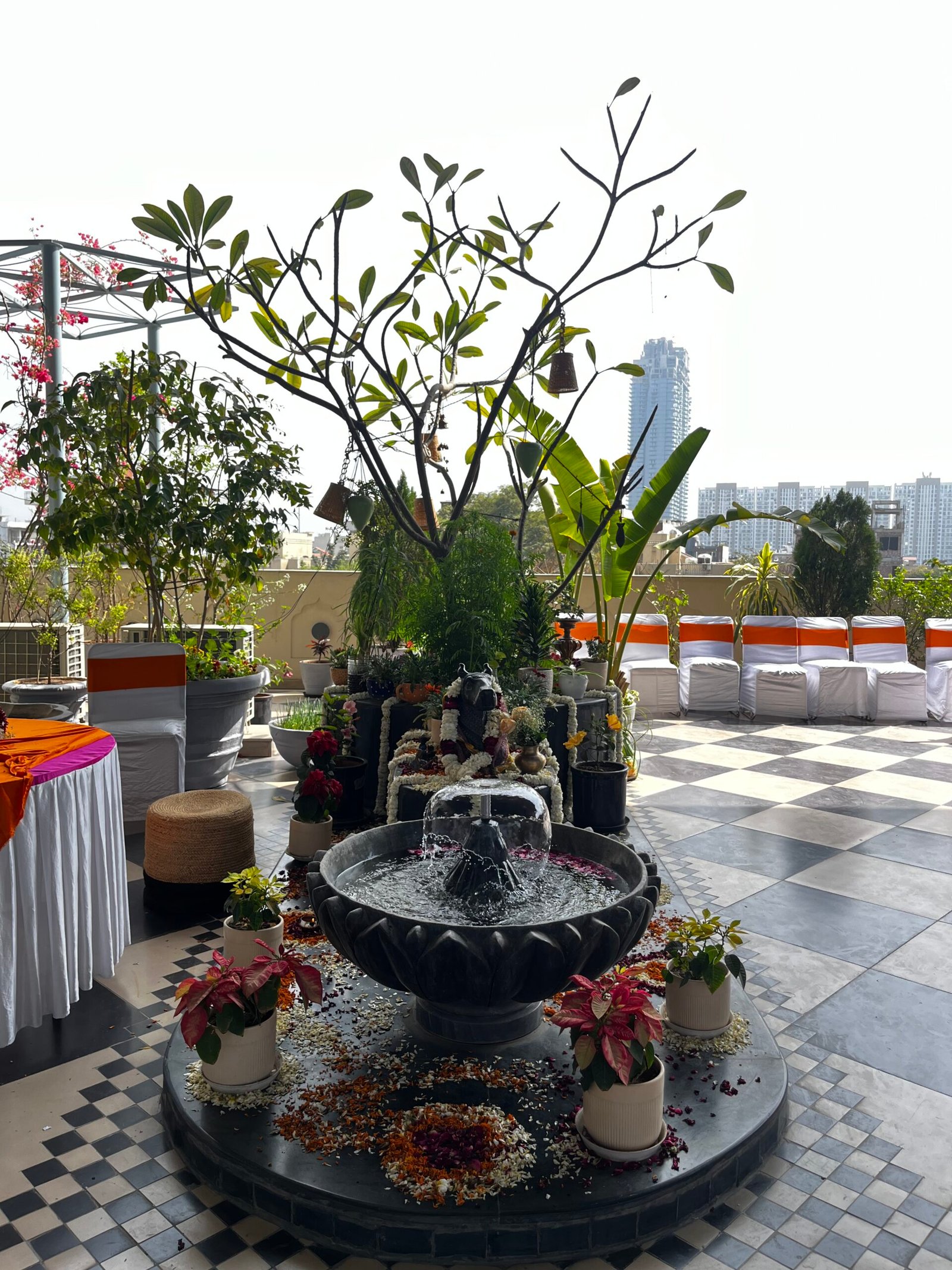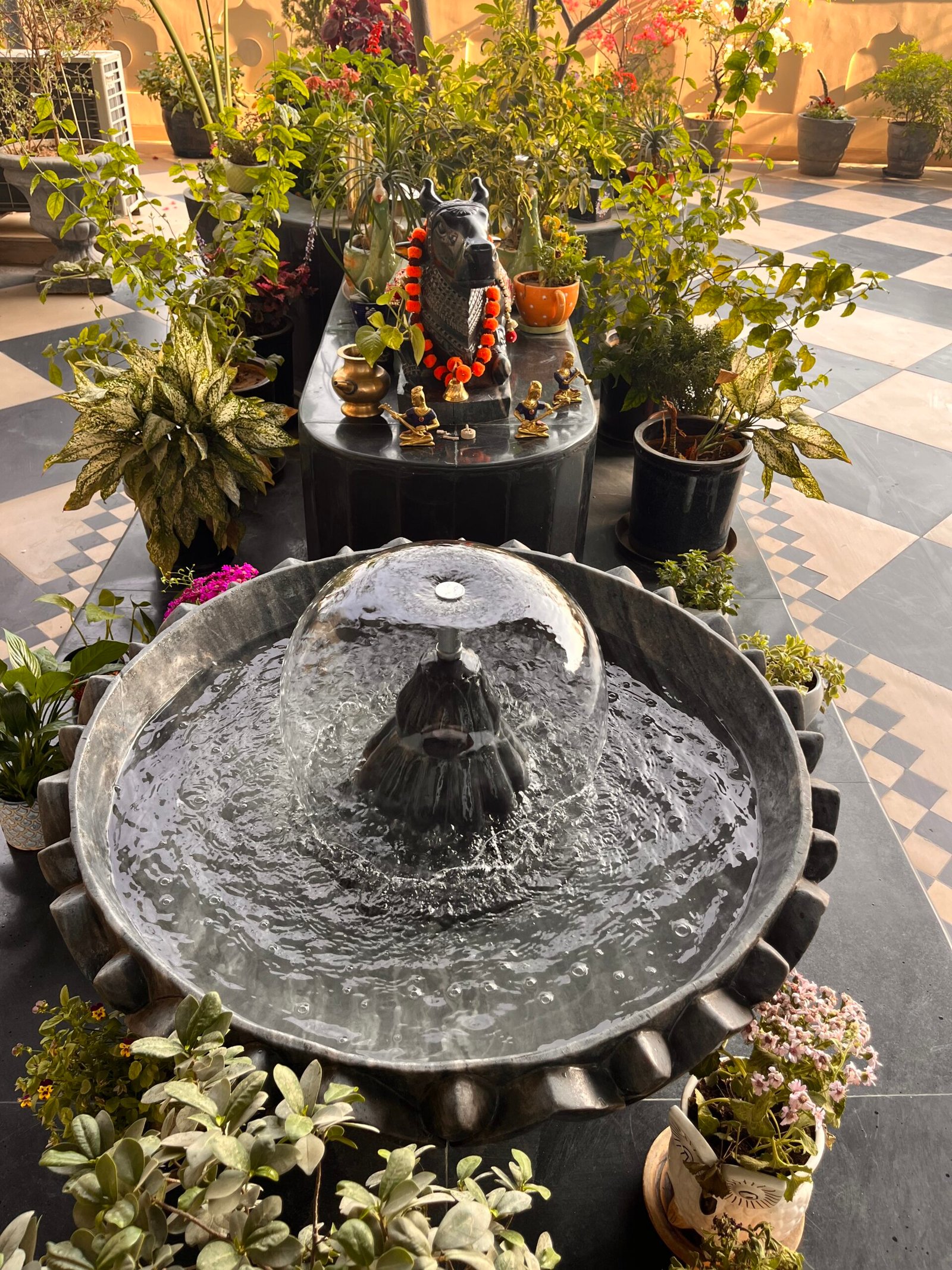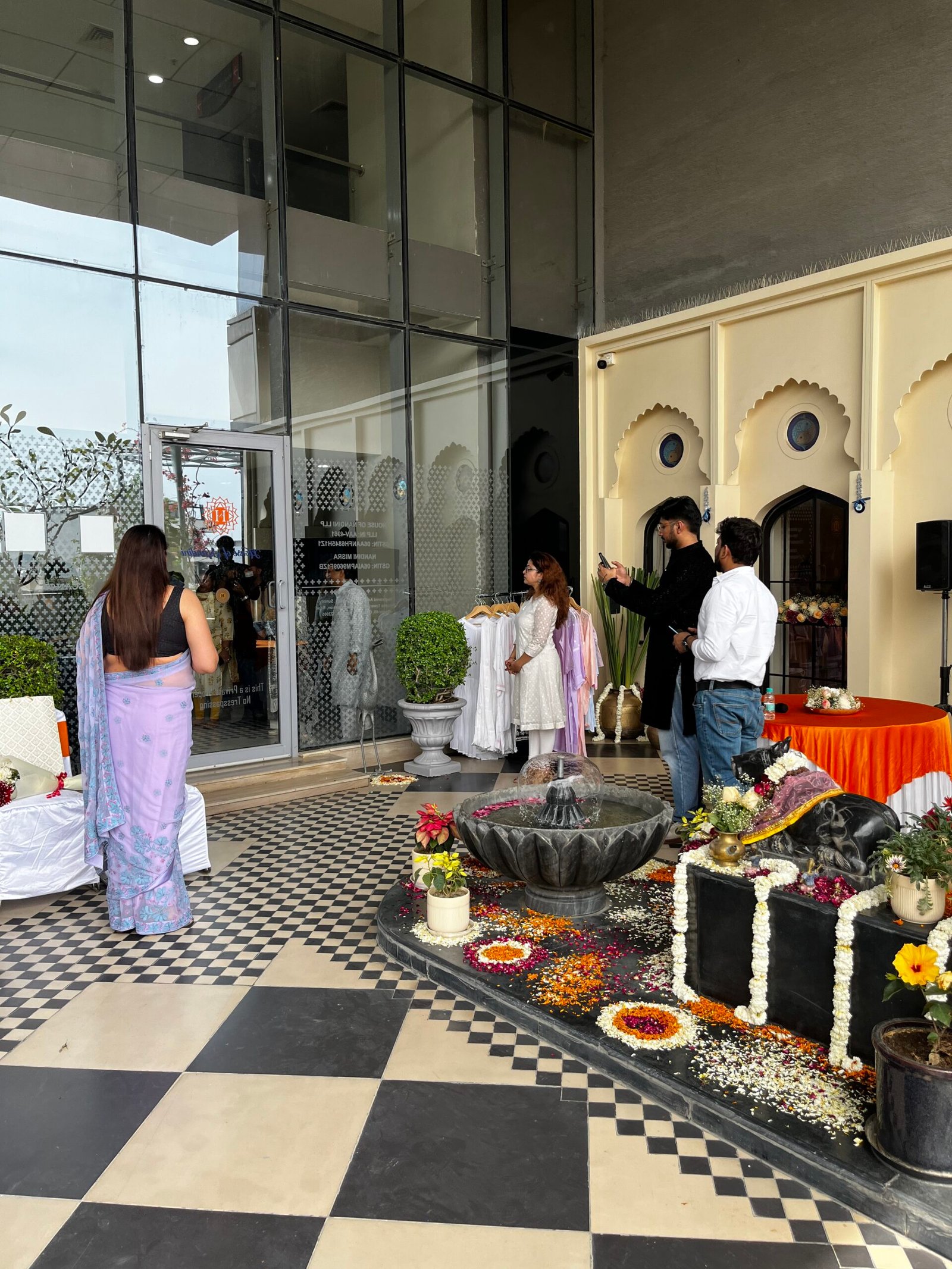 The moment we enter we see the Nandi and a fountain welcoming guests. There will a series of platforms on the right and huge wall with series of arches which actual is the focal point on the left side respectively. The five arches are main feature of space having an entrance glass door and two glass windows. The remaining one arch will have a traditional brass hammered brand logo which used to be there is Lucknow havelis and palaces and other one will have some mural art.