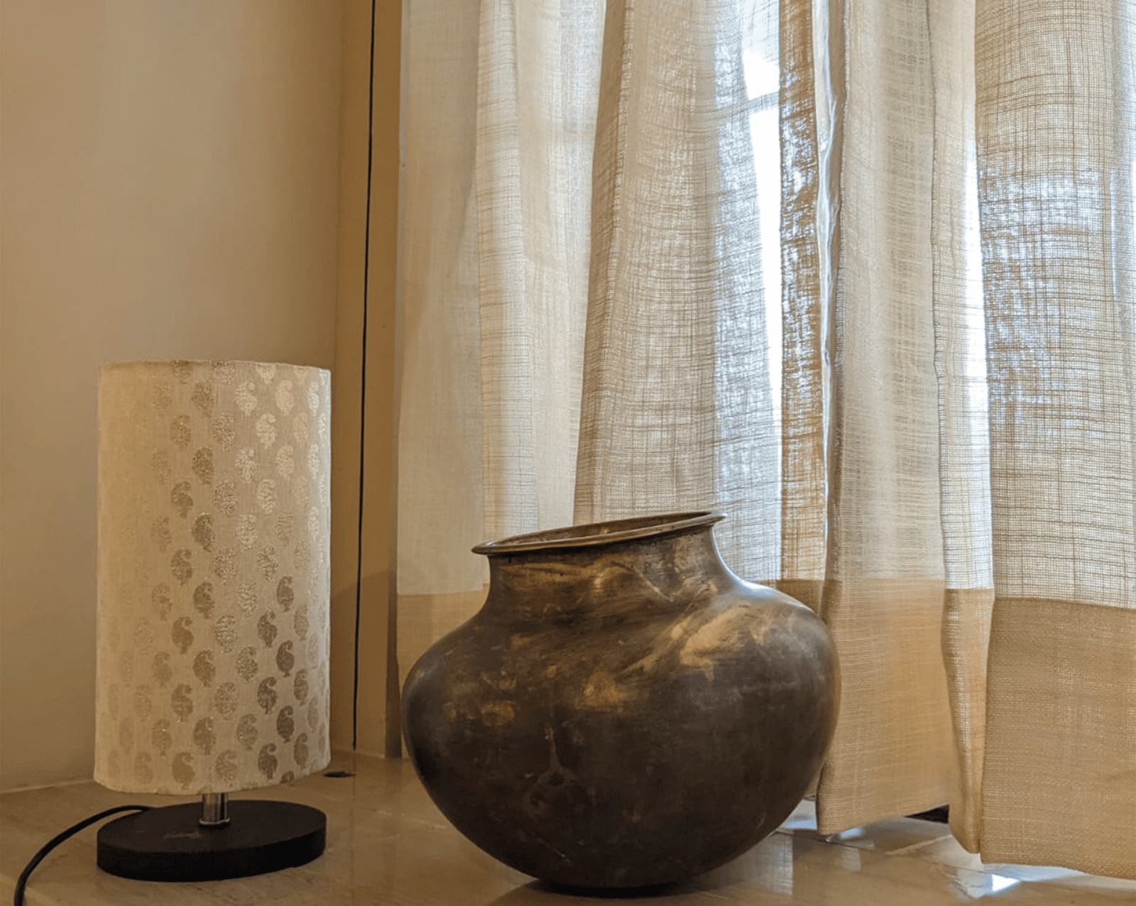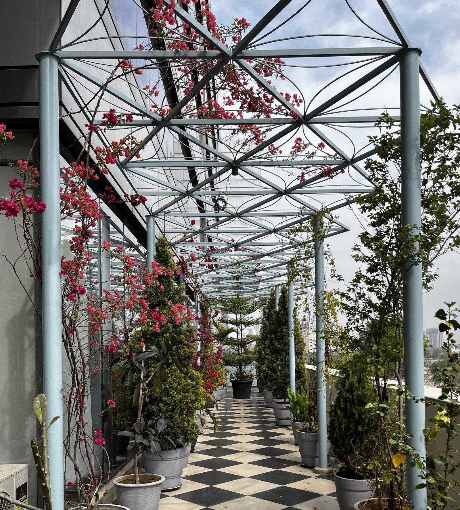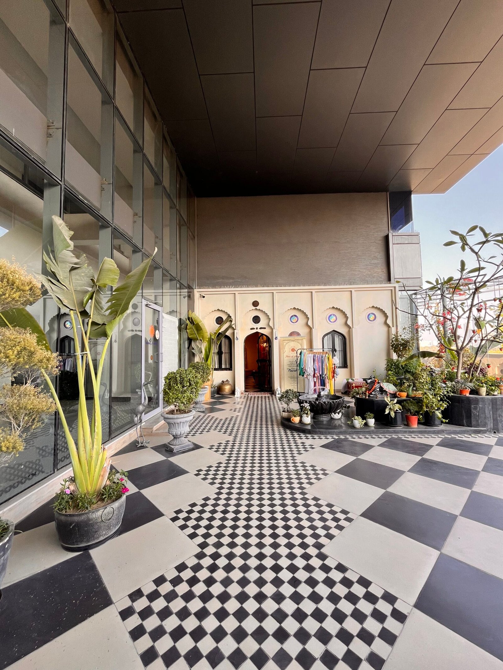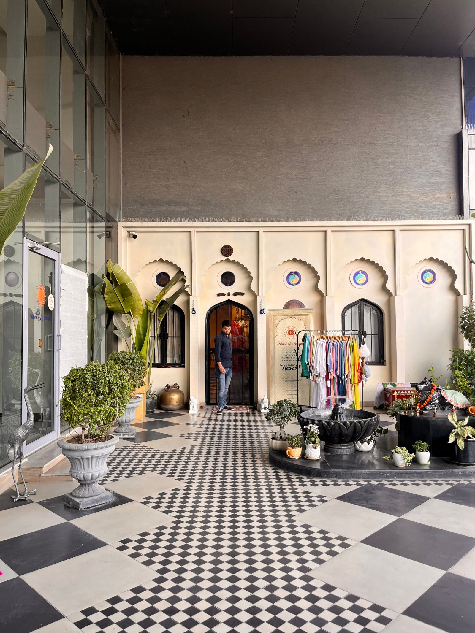 The two spaces copring the complete store. The internal part is primarily for display and discussion. the outside terrace is for hosting guests, events , shoots, promotions at certain times when the weather is suitable. The Opposite side of the arches is a partition all in customized bricks inspired from forms of Lucknow with a seating catering the huge horizontality of the views of the skyline of Gurugram.