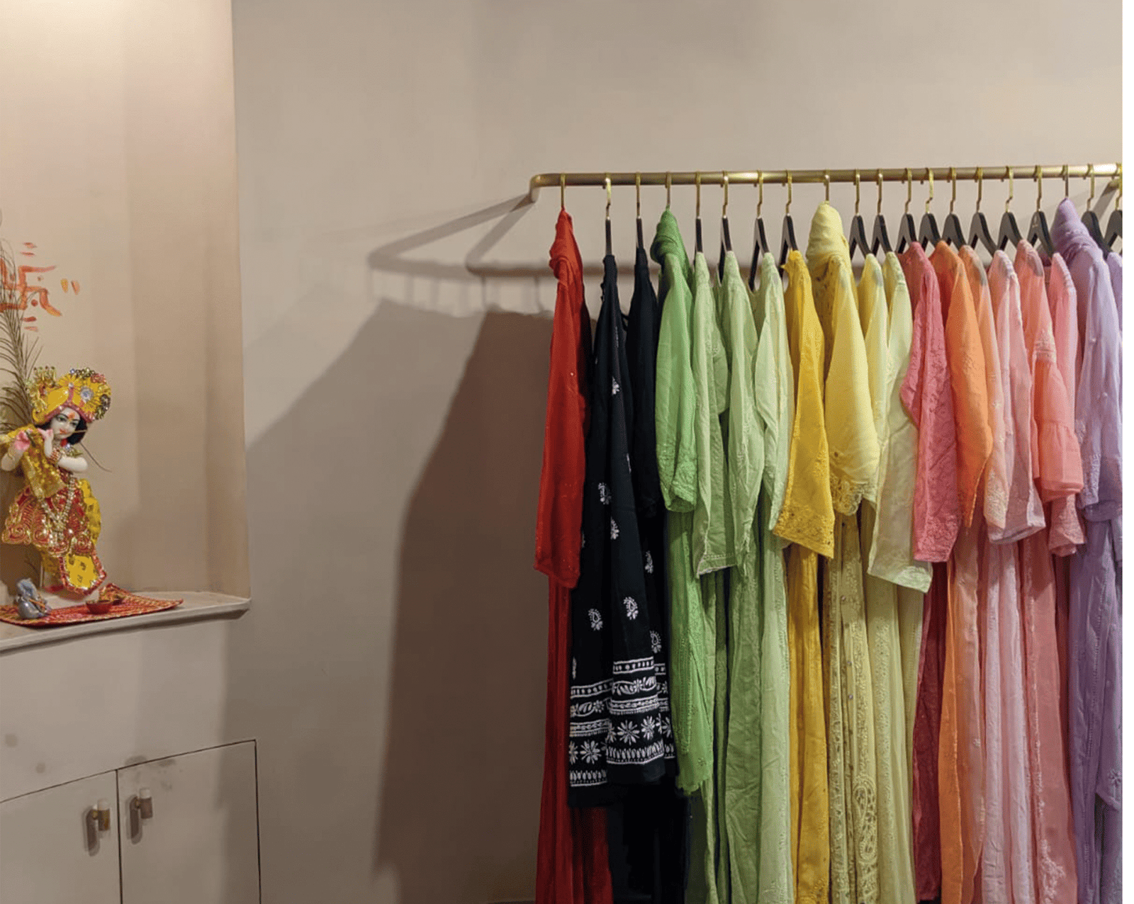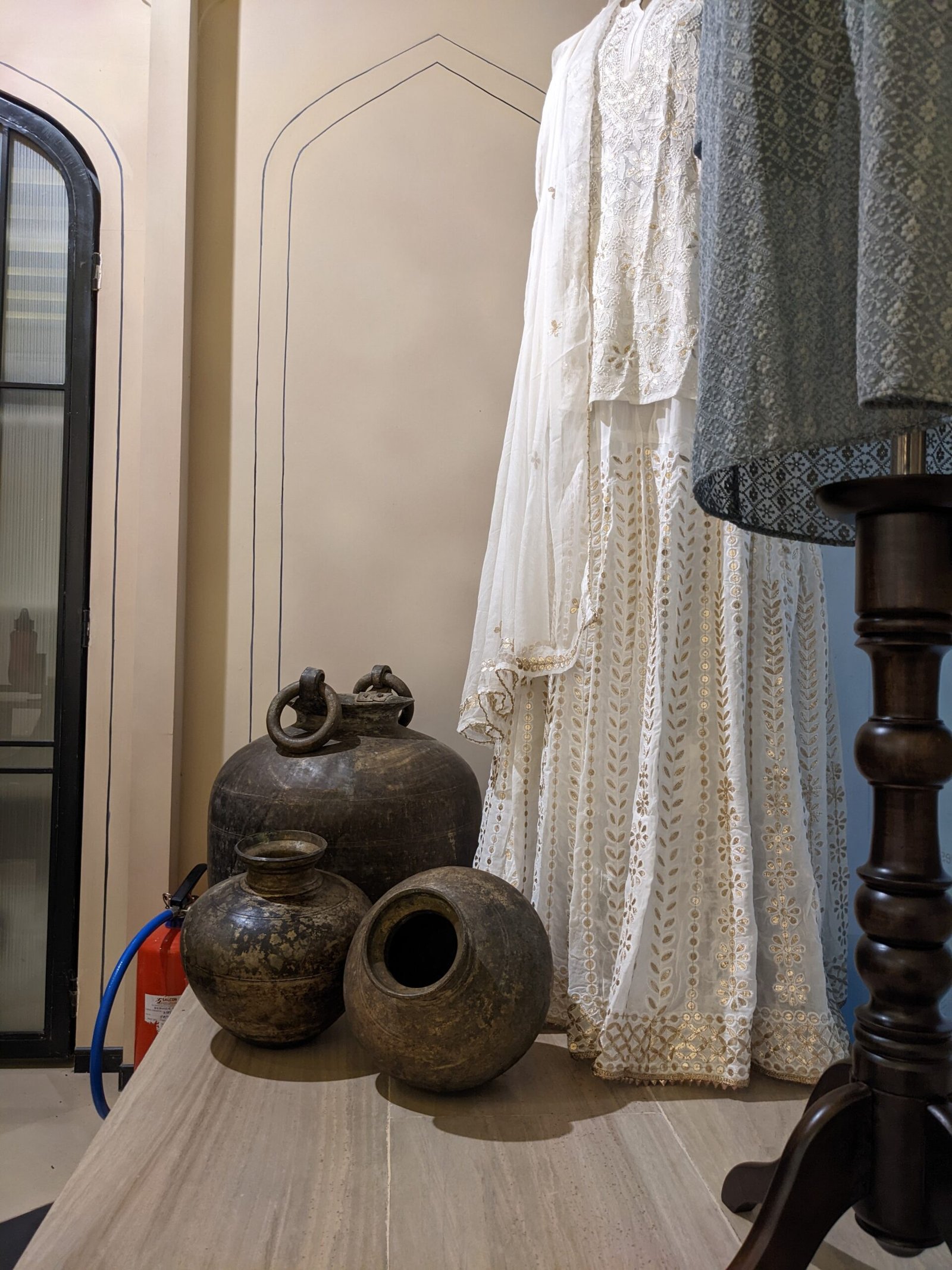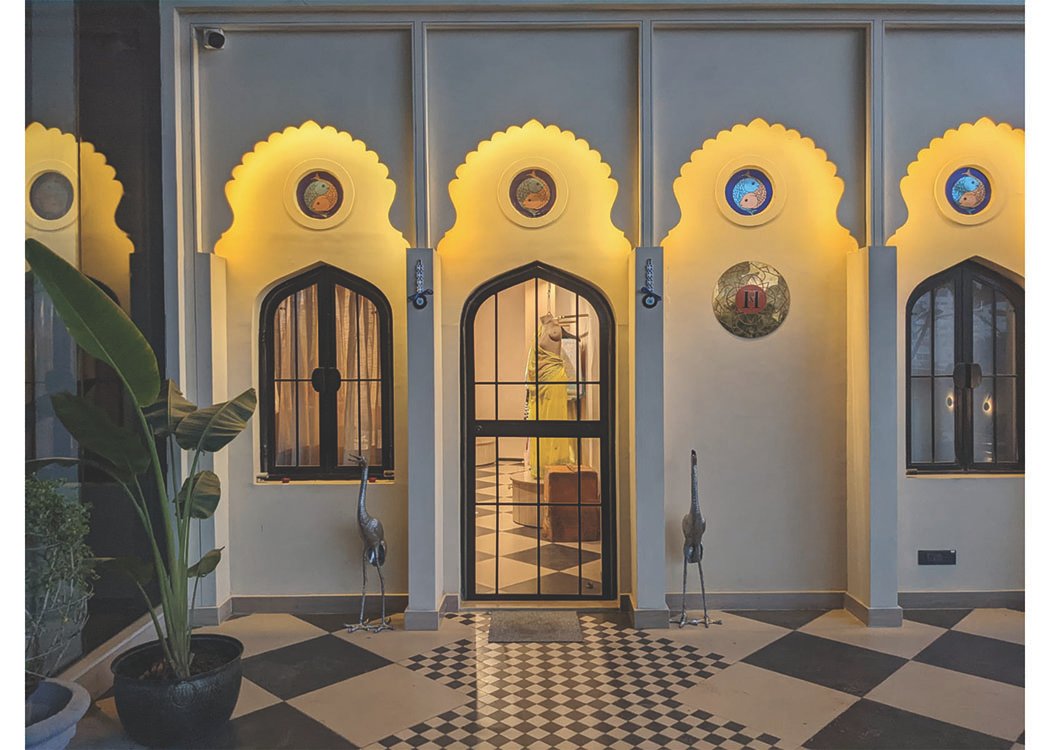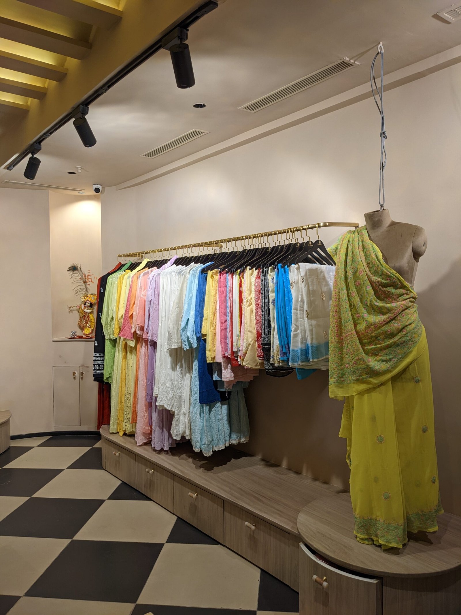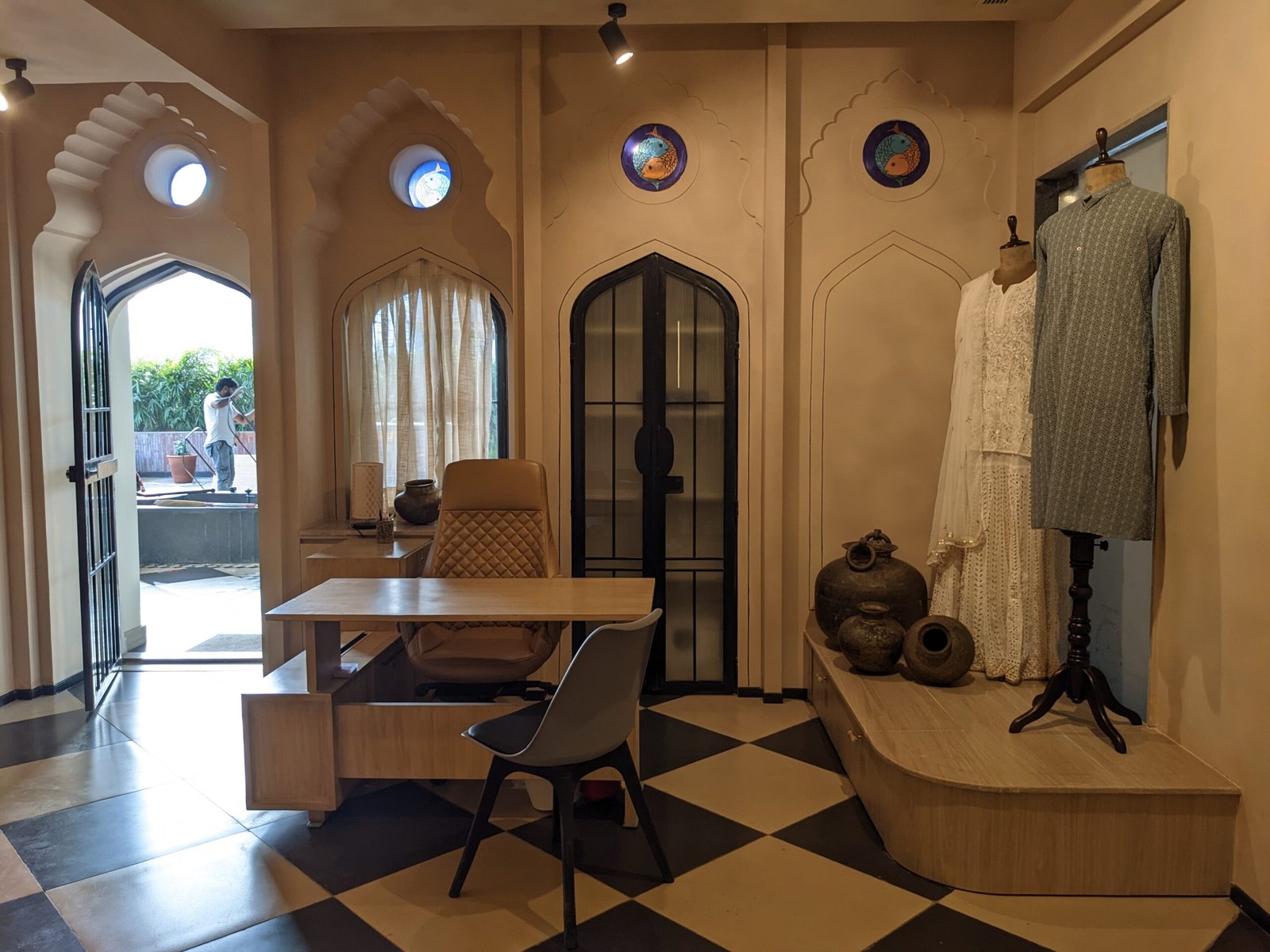 The entrance wall is an arch wall with series of layered arches from inside store with accents of ghungroos in it. To make the entire space monolithic and easy going all the forms are made avoiding right angle edges. The ceiling is in the form of vaults inspired by the structure used in past in havelis of Lucknow. .