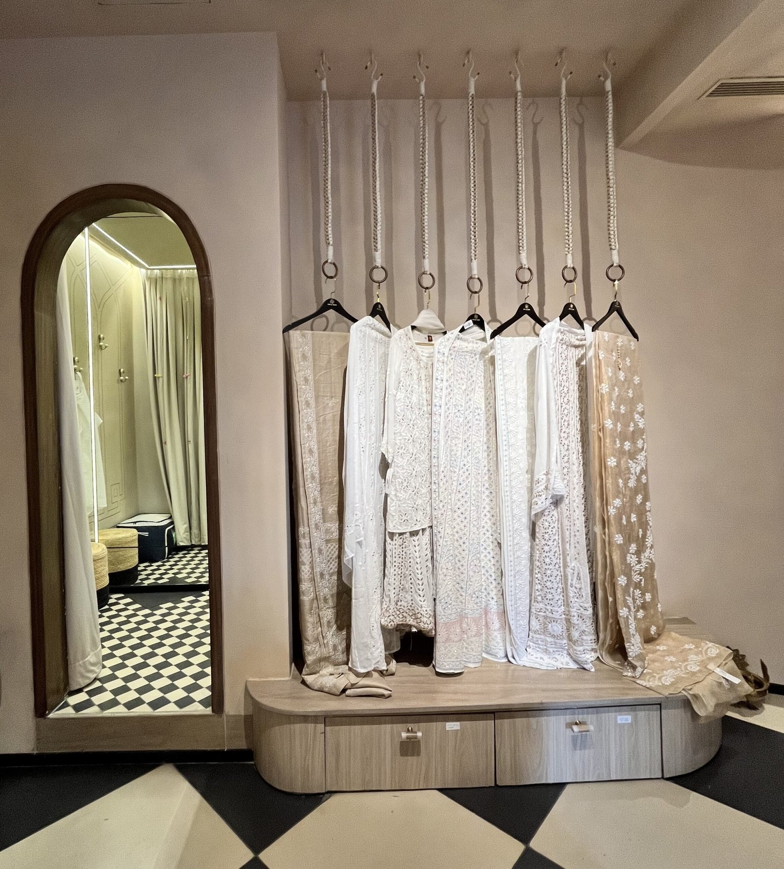 House of Nandini retail store in Gurugram designed by Studio Design-O-Pedia, inspired by Lucknow craftsmanship, featuring arches, vaulted ceilings, brass highlights, and a premium invite-only boutique experience.