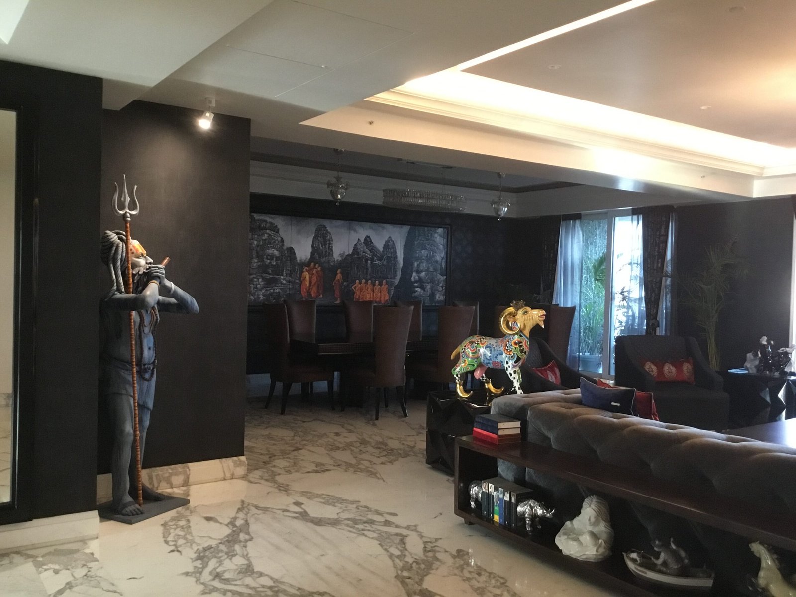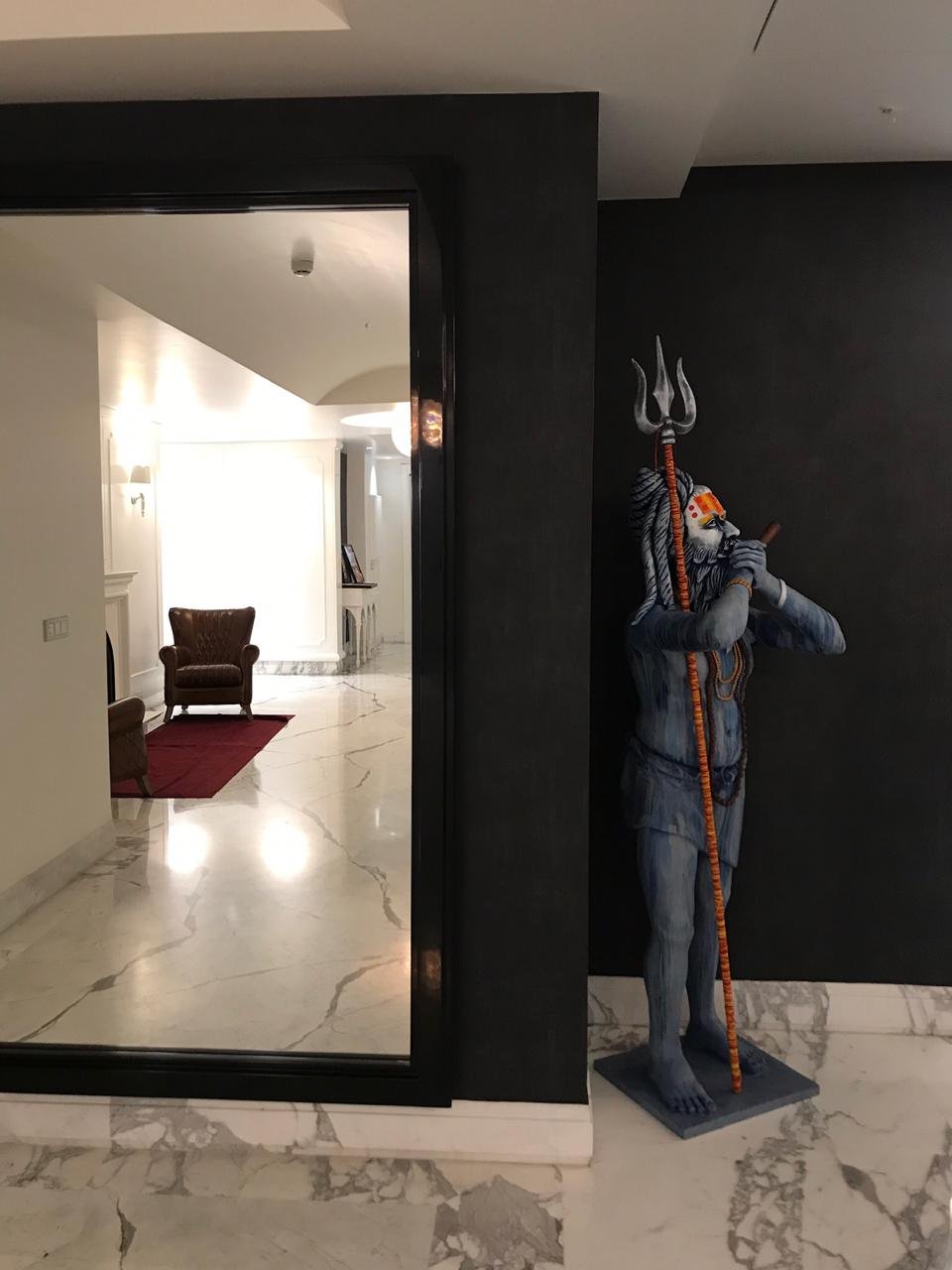 The Decor – A life size sculpture of Baba is planned in corner area of entrance to drawing room, dining & bar. The sculpture of baba has been chosen to create a fusion of modern space with religious roots. The corner tall pedestals have two faces in white and black color complementing each other