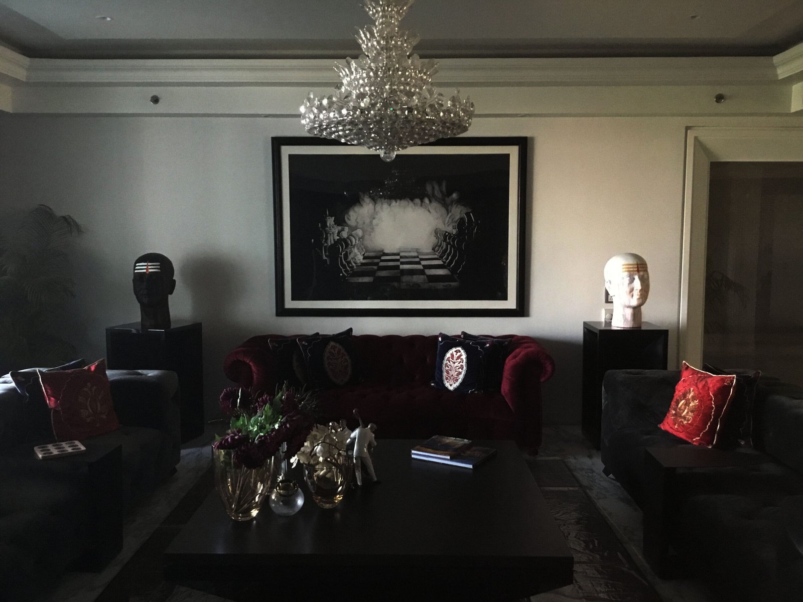 The Drawing Room is designed in such a way to have dark walls in contrast with all white entrance area in other corner. Only one wall is in white color adjacent to a huge windows to obtain maximum reflected natural light. A Kashmiri carpet has been chosen below center table for the seating cluster with subtle & dark tones acting as a binding element for the three existing sofas, a set of bespoke black check-patterned armchairs & elegant tall pedestal tables towards the wall. The existing center table has been coated in black metallic matte. The window wall has elite black versace curtains with golden motifs along with the antique brass planters containing tall areca palms.